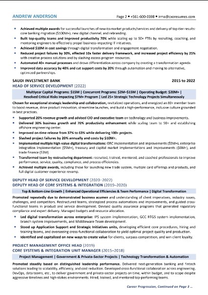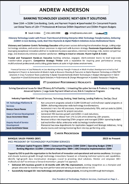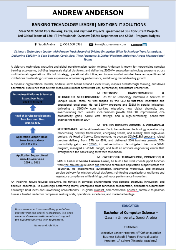 Clean, impactful, and authoritative, built for leaders pursuing C-suite and senior leadership positions.