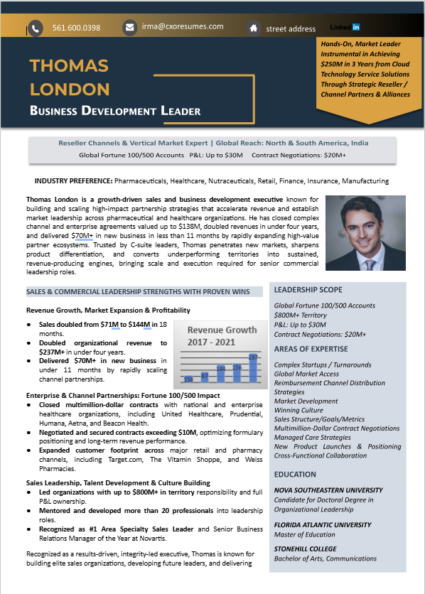 Clean, impactful, and authoritative, built for leaders pursuing C-suite and senior leadership positions.