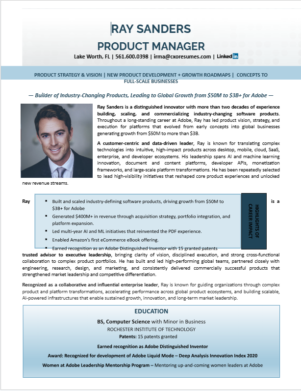 Clean, impactful, and authoritative, built for leaders pursuing C-suite and senior leadership positions.